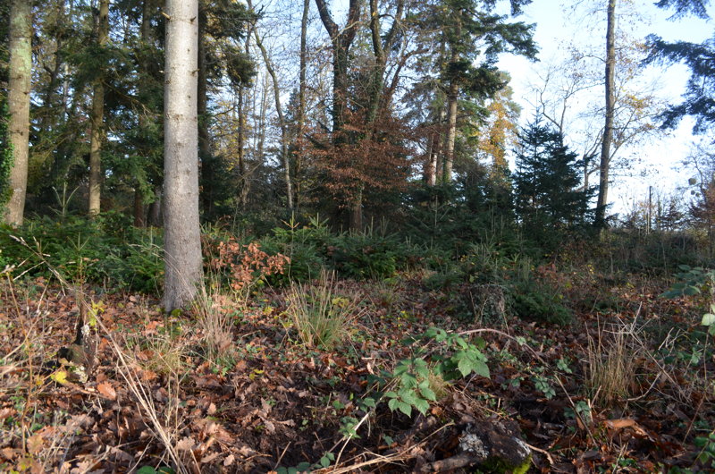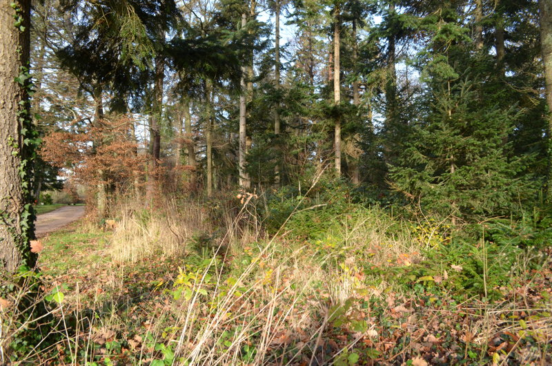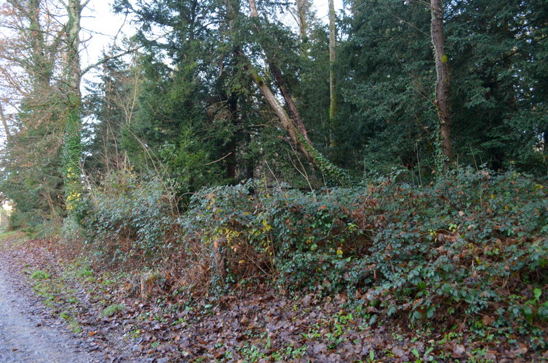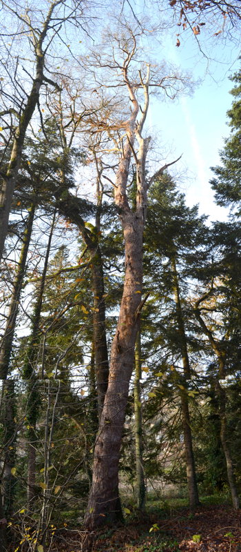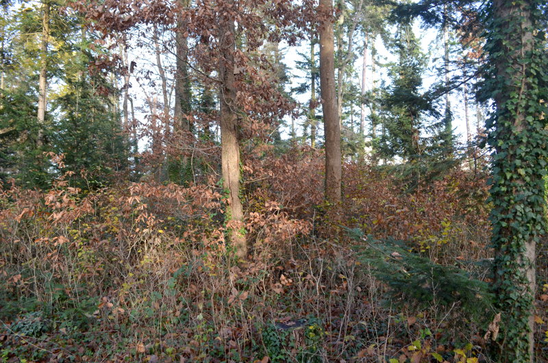 Le peuplement actuel, tant au niveau de sa densité que pour les espèces qui la constituent, se rapproche également plus d’une forêt que d’un parc ornemental : un mélange de futaie* de conifères (sapins pectinés, pins, épicéas) et d’un taillis* de feuillus, ponctué ça et là de quelques arbres remarquables (dont un tilleul), colonisé à divers endroits d’espèces pionnières* (érables) ou invasives (robiniers faux acacias). Côté conifères, les épicéas ont quasiment disparus et les pins sont en piteux état. Quelques ifs égarés ont pu être recensés lors de nos promenades, témoins d’une velléité paysagère ?