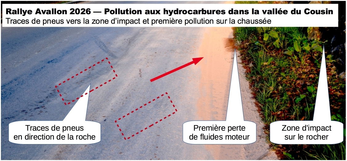 - Pollution chimique aux hydrocarbures - La voiture ayant percuté le mur parvient à refaire quelques mètres, avant de s’arrêter définitivement, en perdant son huile moteur et son huile hydraulique Vidange accidentelle au pavé de Cousin le pont suite à une sortie de route. Aucun protocole de nettoyage sérieux n’ayant été prévu, il a fallu attendre une semaine pour que... après avoir tenté de nettoyer la route avec la lance des pompiers, la ville finisse par comprendre qu’il fallait mettre du produit absorbant. Ce n’est pas très sérieux dans une zone Natura 2000, sur une voie donnant vers la rivière avec une pente moyenne de 23 % !