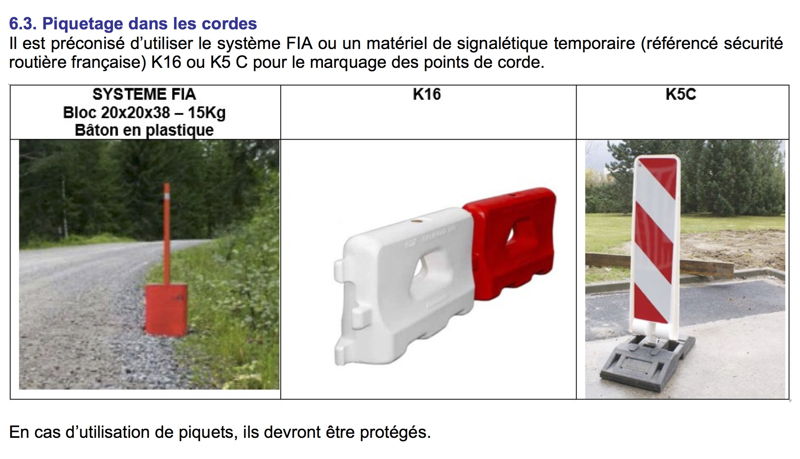 Il est préconisé d’utiliser le système FIA ou un matériel de signalétique temporaire (référencé sécurité routière française) K16 ou K5 C pour le marquage des points de corde. Dans l’hypothèse ou des balises K5C sont utilisées lors d’épreuves de nuit, ces dernières devront être recouvertes sur