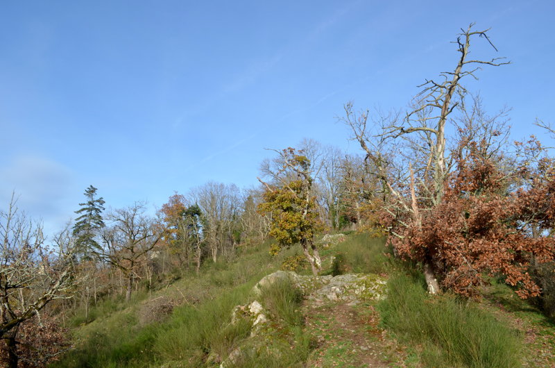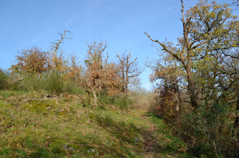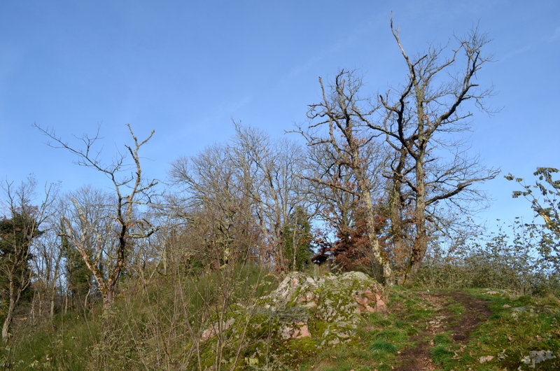 Le peuplement du Parc des Chaumes est très inégal selon l’endroit où l’on se trouve. Au Sud, le lacet grimpe le long d’une pente aux nombreux affleurements granitiques parsemée de genêts, sur laquelle quelques chênes sessiles atteignent péniblement les 7 à 10 mètres pour les plus grands, avec beaucoup de bois mort. Même les robiniers faux acacias, espèce invasive et colonisatrice qui semble vouloir s’y installer, survit avec difficulté. Le sol est peu profond. Il y règne une atmosphère de western et l’on s’attend à voir Zoro surgir des chênelets sur son fameux Tornado.