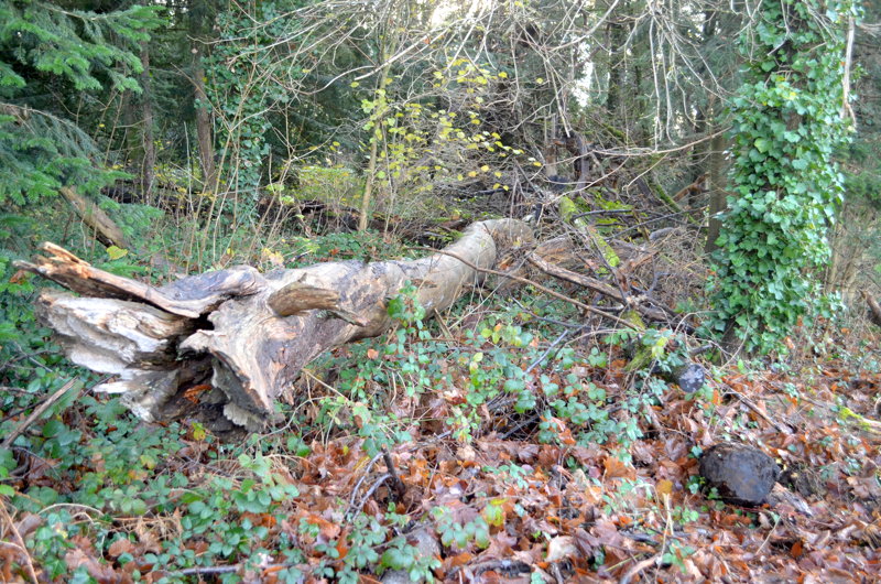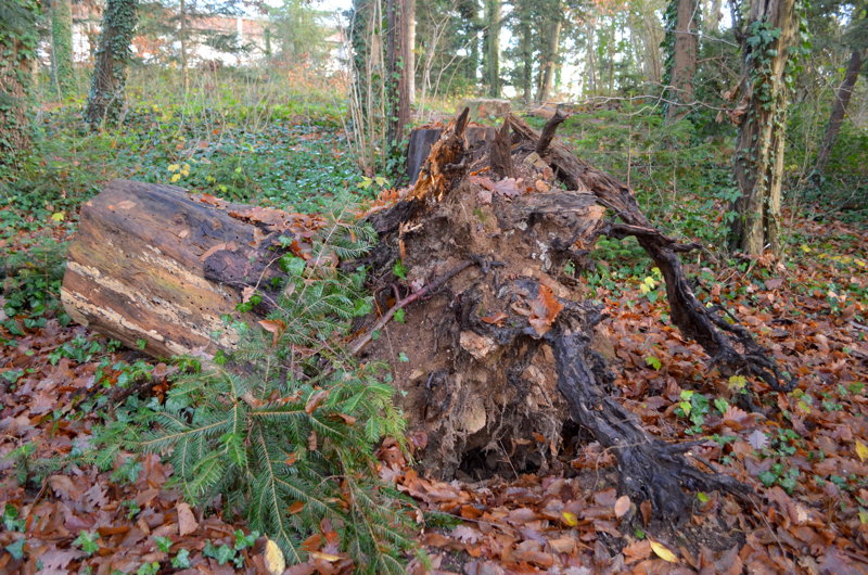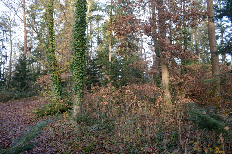 Le peuplement actuel, tant au niveau de sa densité que pour les espèces qui la constituent, se rapproche également plus d’une forêt que d’un parc ornemental : un mélange de futaie* de conifères (sapins pectinés, pins, épicéas) et d’un taillis* de feuillus, ponctué ça et là de quelques arbres remarquables (dont un tilleul), colonisé à divers endroits d’espèces pionnières* (érables) ou invasives (robiniers faux acacias). Côté conifères, les épicéas ont quasiment disparus et les pins sont en piteux état. Quelques ifs égarés ont pu être recensés lors de nos promenades, témoins d’une velléité paysagère ?