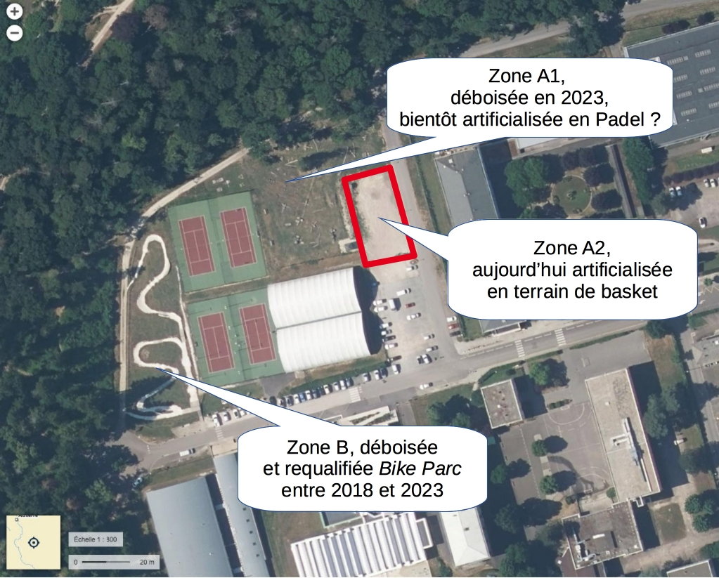 Les dernières parcelles déboisées jusqu’en 2023 pour raison sanitaire (plantation monospécifique d’épicéas scolytés) auraient pu être reboisées avec un mélange d’espèces indigènes au lieu d’être requalifiées* en bike parc ou être artificialisées en terrain de basket. Il est en effet totalement contradictoire, sous couvert de prophylaxie* d’affaiblir davantage l’écosystème forestier en réduisant son espace vital, surtout quand ce dernier fait partie intégrante d’une charte avec la LPO BFC. Après les terrains de tennis, un nouveau jeu de balle à la mode (le padel) va occasionner une artificialisation de la dernière zone verte résiduelle après les abattages de 2023.
