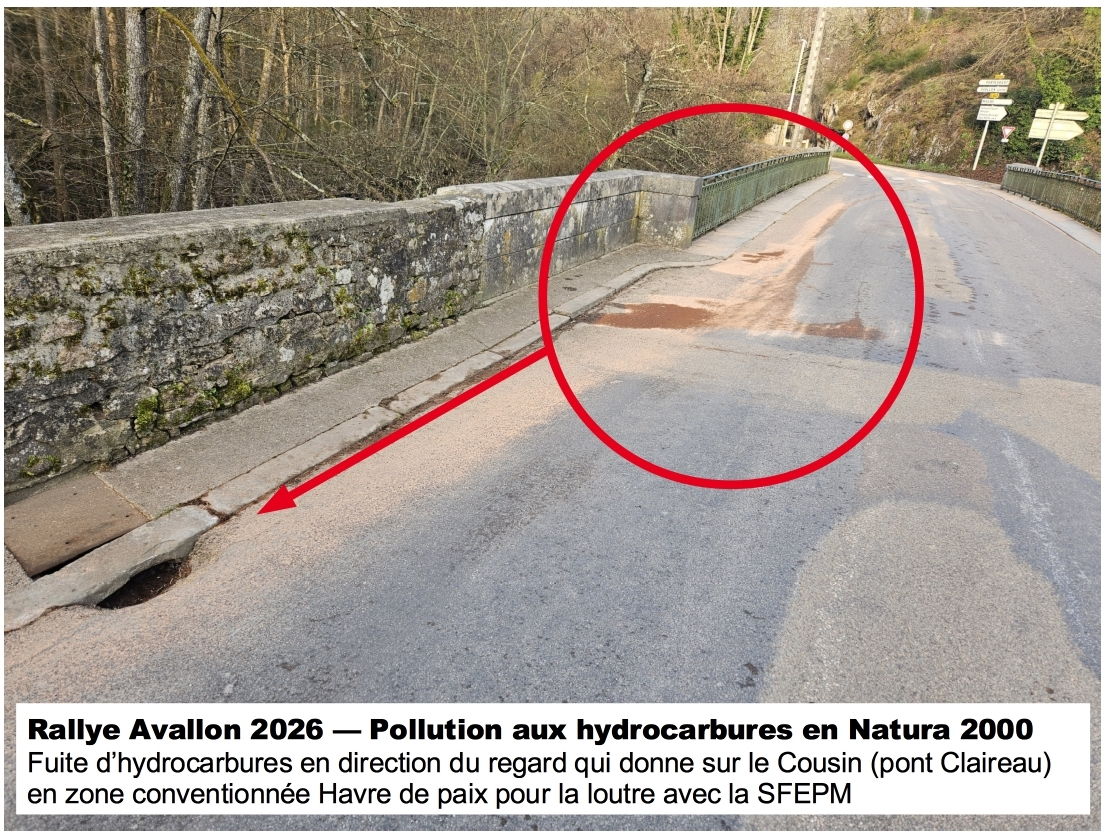 Cette année, le rallye n’a pas laissé que des traces de pneu. Le 7 mars 2026, en pleine zone Natura 2000 et dans un espace conventionné Havre de paix pour la Loutre avec la SFEPM (Société française pour l’étude et la protection des mammifères) une pollution aux fluides moteurs a été constatée juste au-dessus du Cousin. La SFEPM, la SHNA la DDT, la DREAL, le Parc du Morvan et la FNE ont été alertés.
