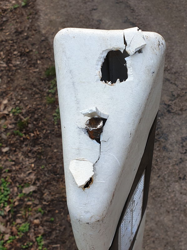 Rallye avallonnais 2026 — Détail du dessus d’un délinéateur laissant voir l’extrémité du fer à béton