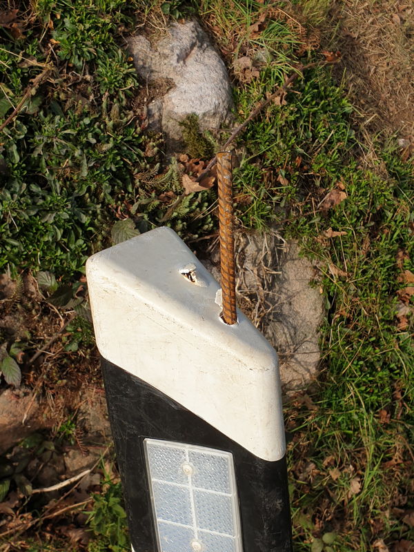 Rallye avallonnais 2026 — Détail du fer à béton au sommet du délinéateur en plastique